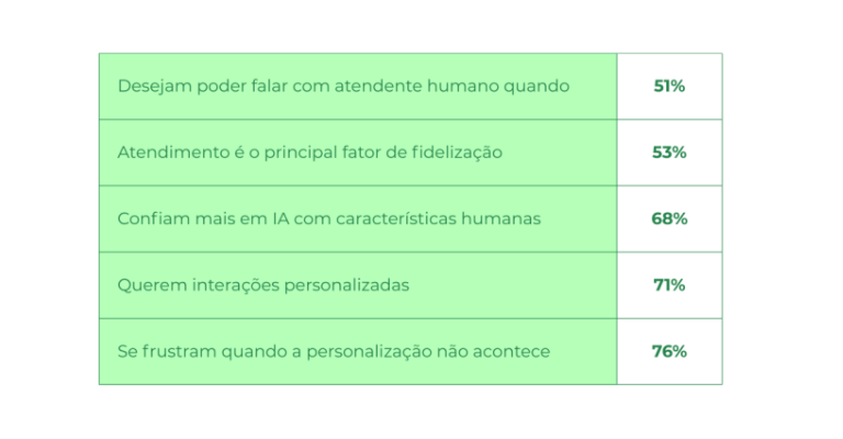 Investir nisso pode trazer resultados significativos para a imagem da empresa, pois 68% dos consumidores dizem ser mais propensos a interagir e confiar em agentes de IA com características semelhantes às humanas, segundo o mesmo relatório.